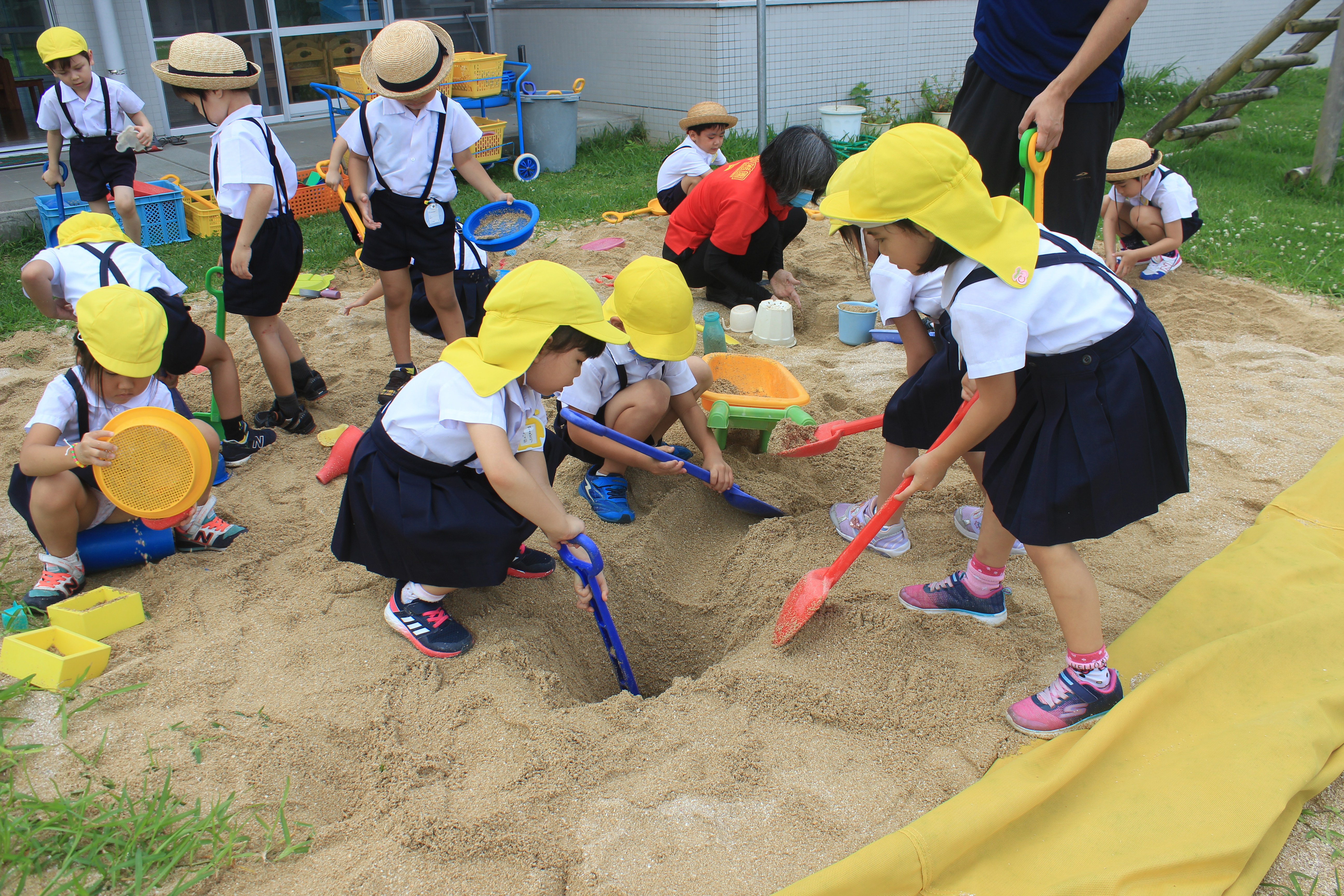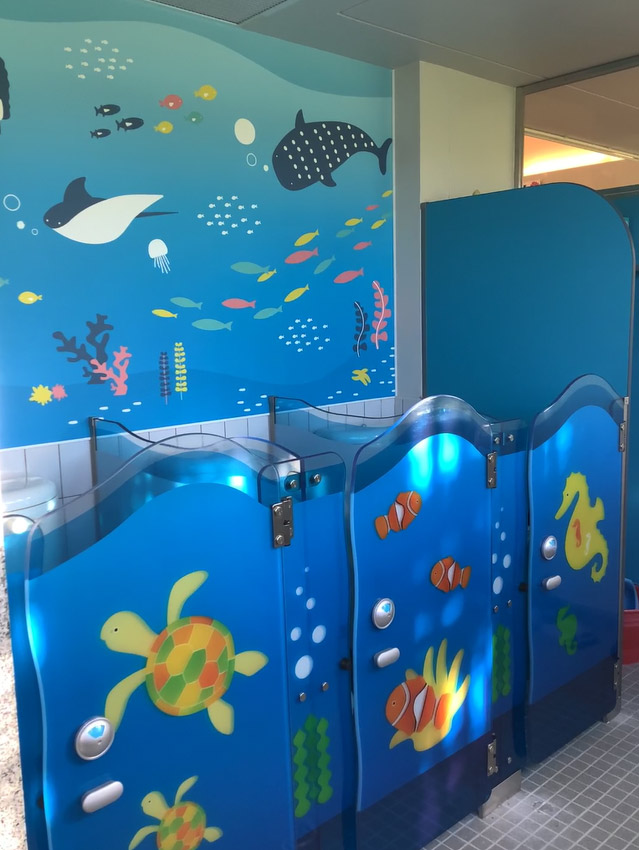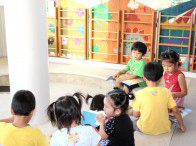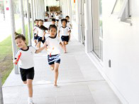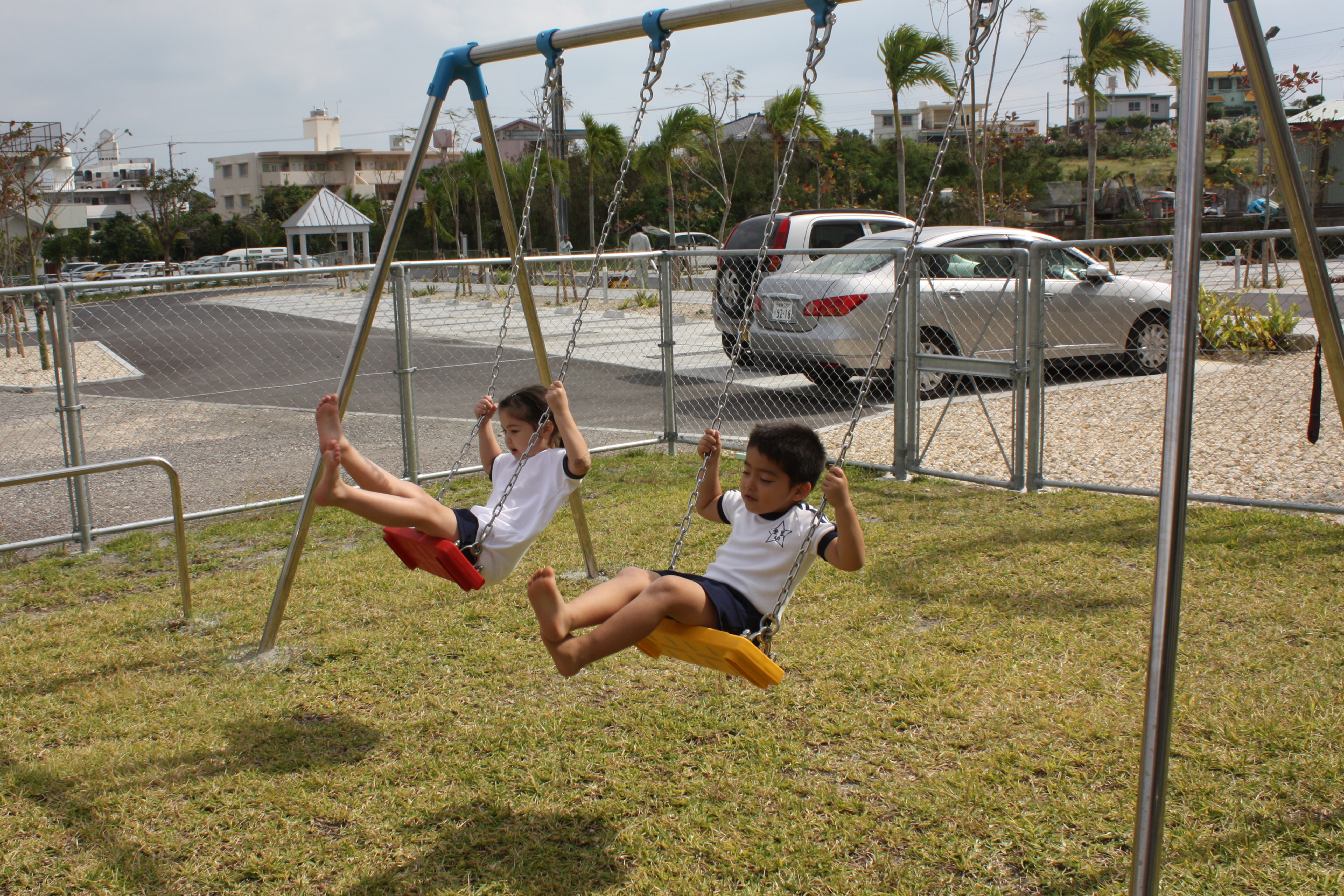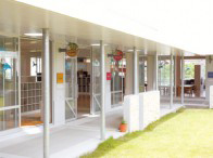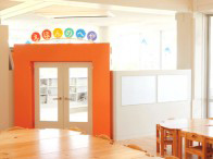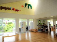 光と風が流れる広々とした室内です。園児のテーブルとイスの素材は、琉球松を使用、又、各部屋には沖縄をモチーフにしたモビールがあり、子どもたちをあたたかく迎えます。絵本の部屋の扉を開けるとそこは夢空間。お話しの世界に心が広がります。